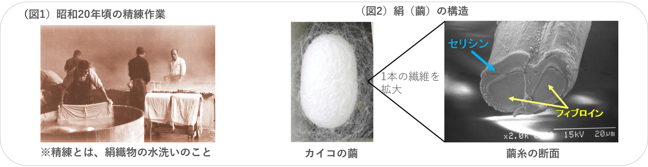 総合繊維メーカー発のエイジングケア化粧品ブランドで、ピュアセリシン™を高配合しております。祖業の精練(図1)に携わる職人の手は、厳しい水仕事にもかかわらず、いつも白く輝いていました。当社はこの秘密が、絹に含まれるタンパク質セリシン(図2)であることを突き止め、「ピュアセリシンTM」を開発しました。