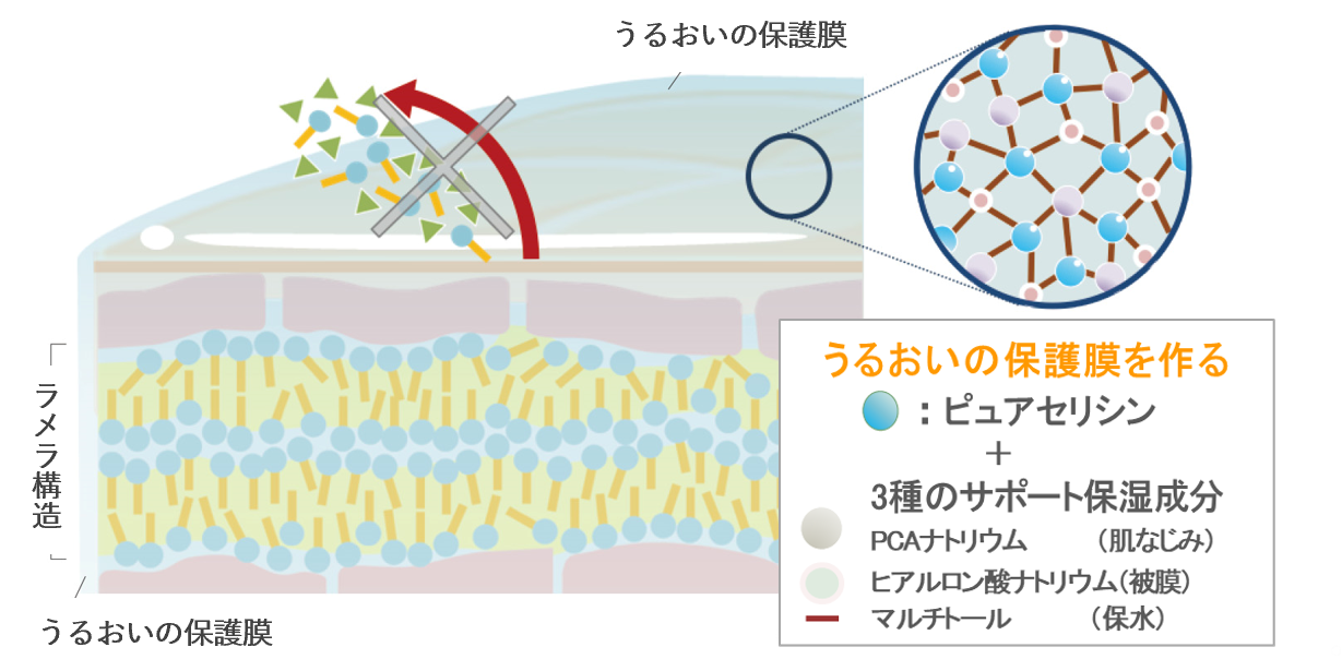 ピュアセリシン™と3種のサポート成分が結びついて、うるおいの保護膜を作ります。保護膜によって洗顔によって流されやすい肌にうるおいを保持する「ラメラ構造」を守り、次に使用するスキンケアの浸透※2を高めます。