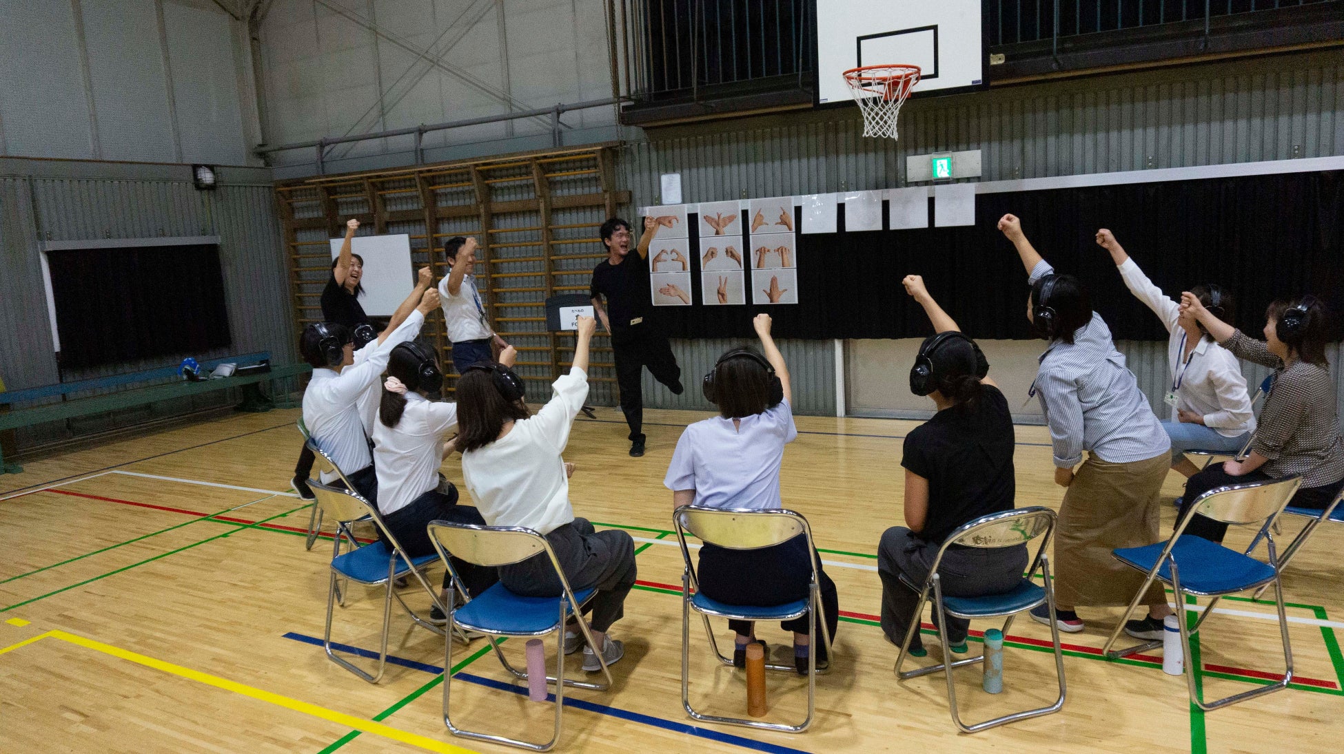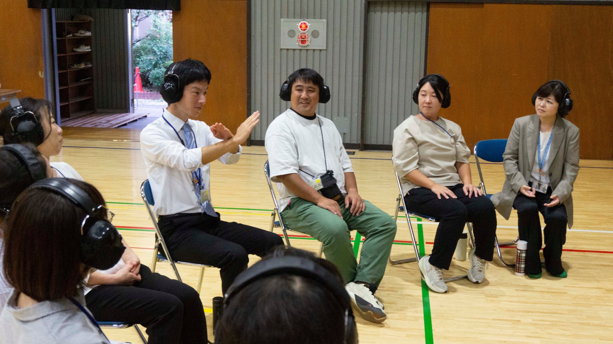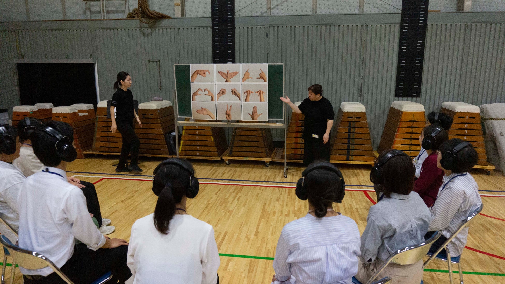 当日は聴覚障害者のスタッフの案内により103名の先生方が「ダイアログ・イン・サイレンス」を体験しました。「ダイアログ・イン・サイレンス」では、参加者がヘッドセットを装着し、音のない環境でジェスチャーや表情などを使いながらコミュニケーションを体験します。プログラムの最後には、体験中に得られた気づきや発見を共有し、言葉の壁を超えた対話やダイバーシティについて考えていただく時間を設けました。