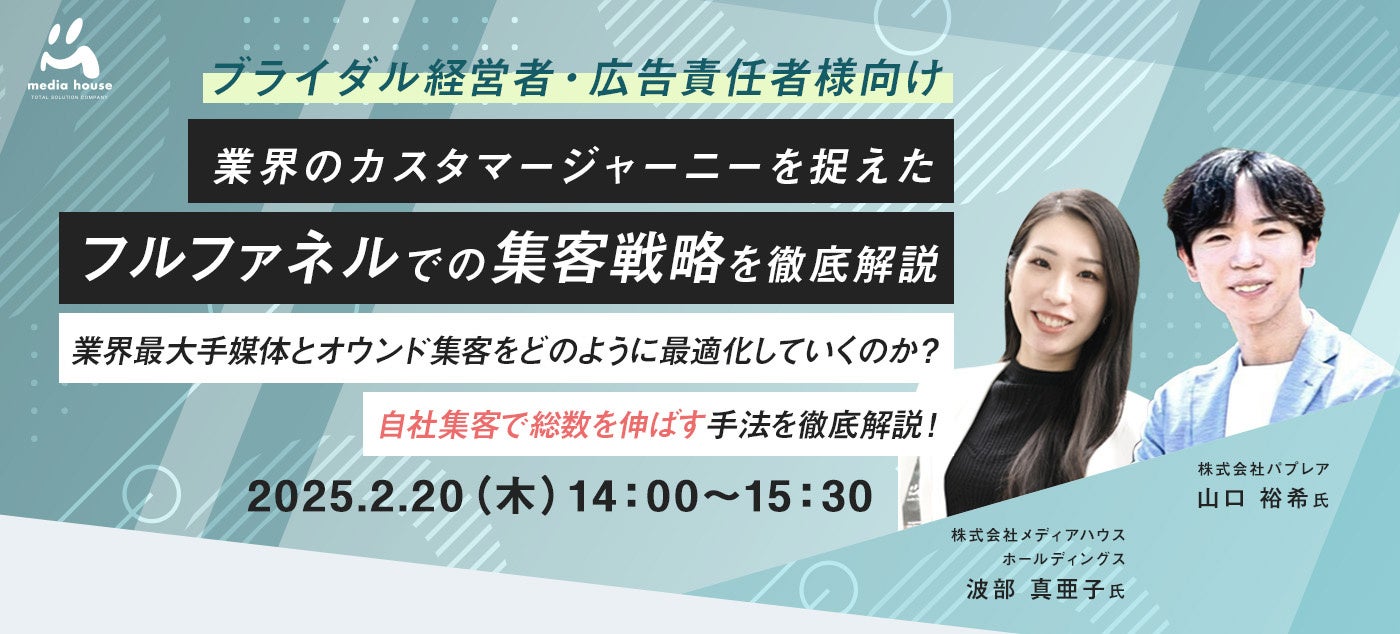 【2/20(木)ブライダル経営者・広告責任者向け無料セミナー開催】 業界最大手媒体とオウンド集客をどのように最適化していくのか?自社集客で総数を伸ばす手法を徹底解説!