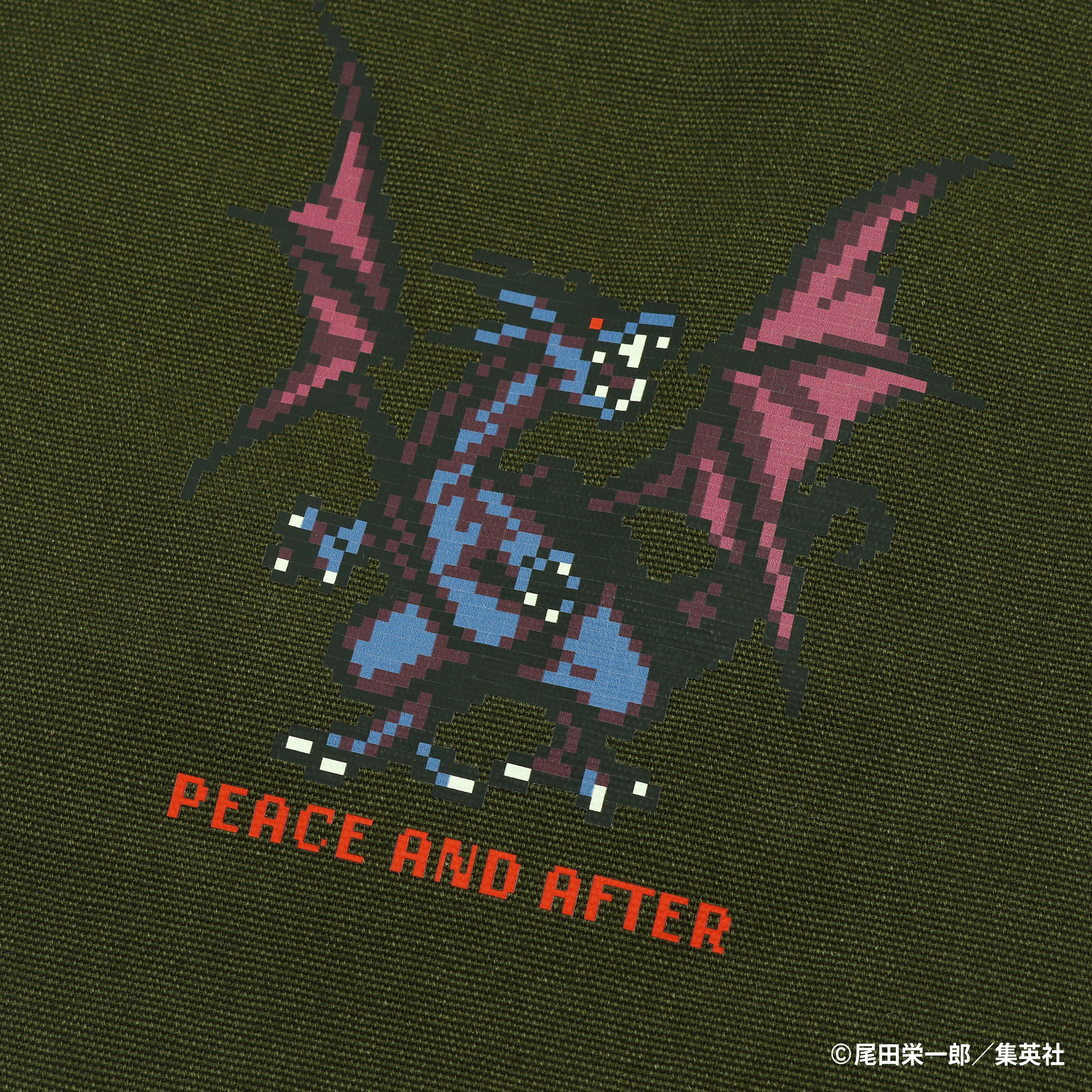今回のコラボレーションでは、作中に登場するキャラクターをPeace and Afterを象徴するピクセルアートで表現し、トートバッグや携帯ケースに仕上げました。猛々しいドラゴンをダイナミックに描いたプリントTシャツも登場します。