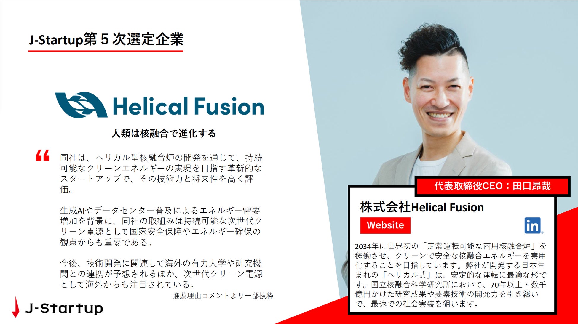 株式会社Helical Fusion(本社:東京都中央区、代表取締役CEO:田口昂哉、以下「Helical Fusion」)は、経済産業省が運営するスタートアップ支援プログラム「J-Startup」の第5次選定企業に選出されました。