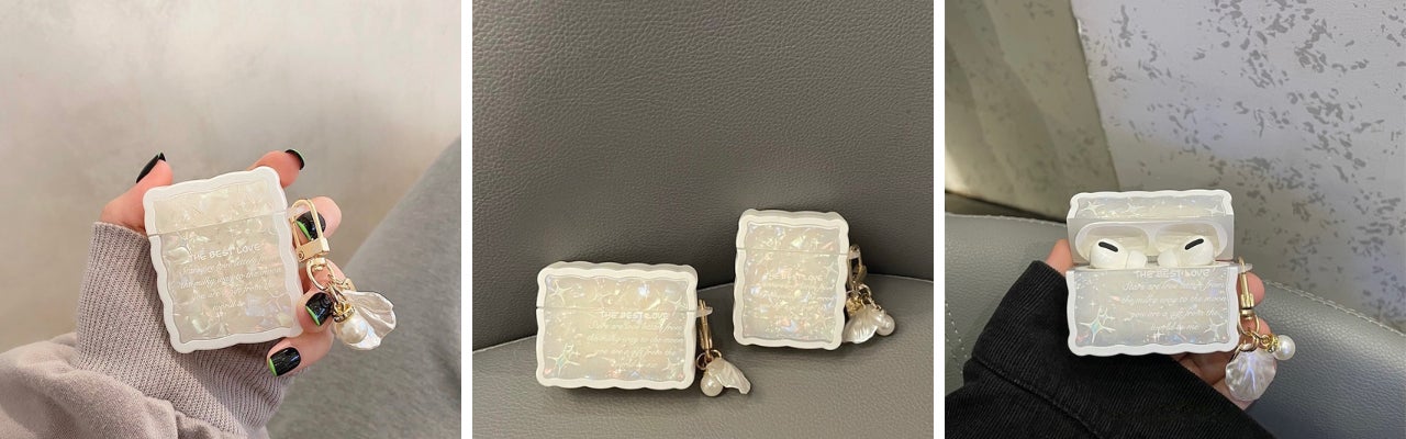 光の当たる角度によってさまざまな表情を見せてくれるシェル柄のAirPodsケースです。全体は清楚かつ大人っぽいホワイトで統一され、付属の上品可愛いシェルチャームと良く合います。