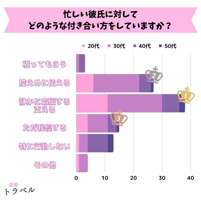 忙しい彼氏との付き合い方について『静かに応援する/支える』という方が、どの年代でも1番多く意見が集まりました。