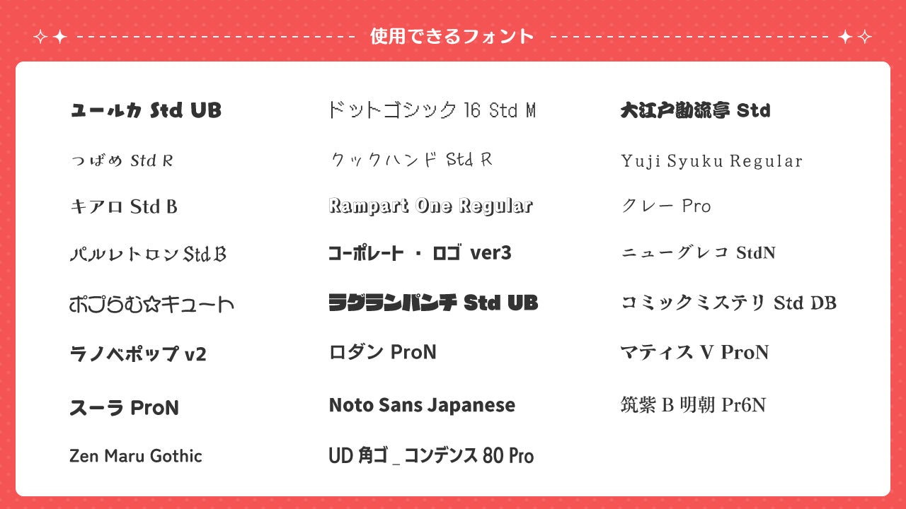 フォントの選定にあたっては、現役VTuber・配信画面デザイナーと共に、最も配信活動での利用をおすすめしたい23フォントを厳選して公開しました。これらのフォントは全て無料でご利用いただけます。