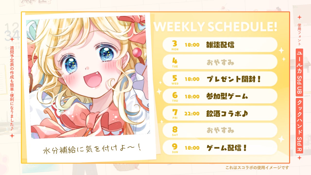 スコラボ上でカレンダー素材の上に直接内容を書き込み、OBS Studio等配信ソフトのシーンのスクリーンショット機能を活用することで、毎週異なる表情を自撮りする形で、気軽にスケジュール画像を書き出すことができます。詳しくは解説記事をご覧ください。