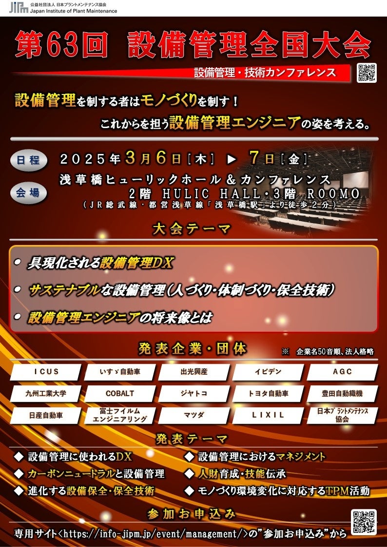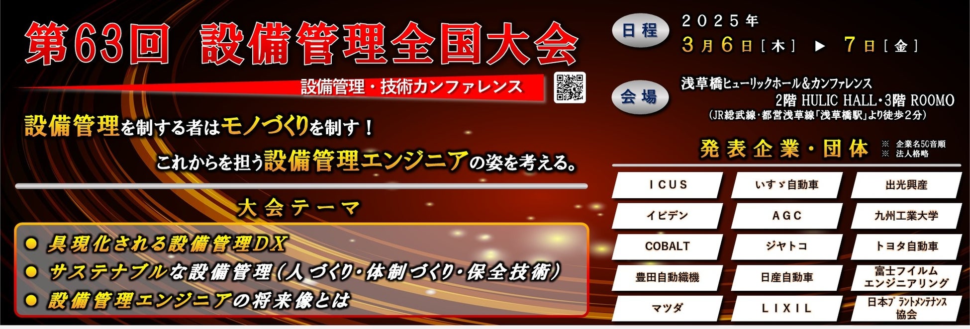 第63回 設備管理全国大会(設備管理・技術カンファレンス) 2025年3月6日(木)▶7日(金)浅草橋ヒューリックホール&カンファレンス(公益社団法人日本プラントメンテナンス協会)