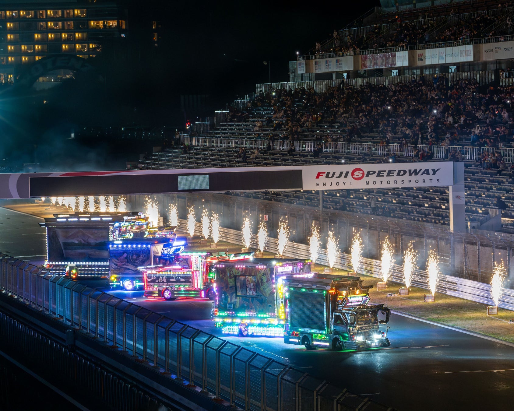富士スピードウェイの本コースを舞台に、花火打揚までの間、多彩な走行プログラムを展開します。