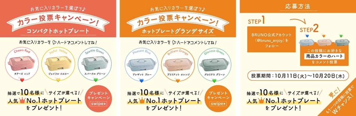ブランド10周年を記念し、BRUNOファンみんなでお気に入りのホットプレートカラーを選び、人気No.1に選ばれたカラーを商品化する「カラー投票キャンペーン」を2022年10月にSNSで開催。