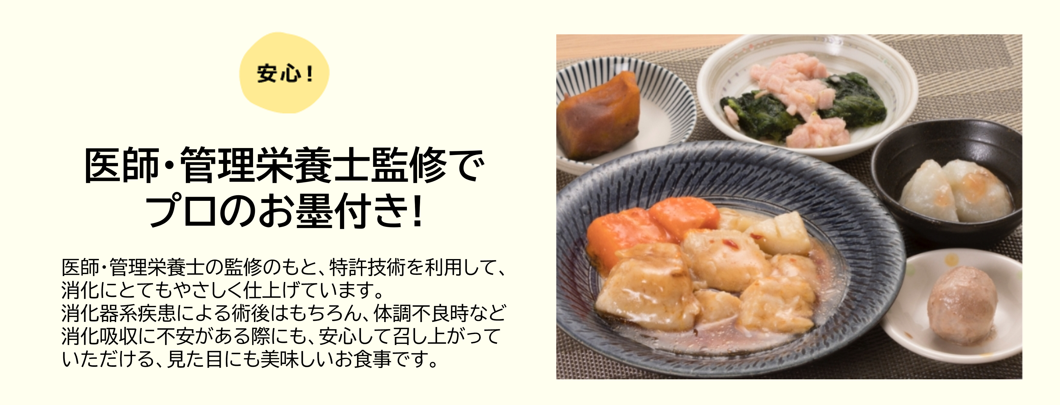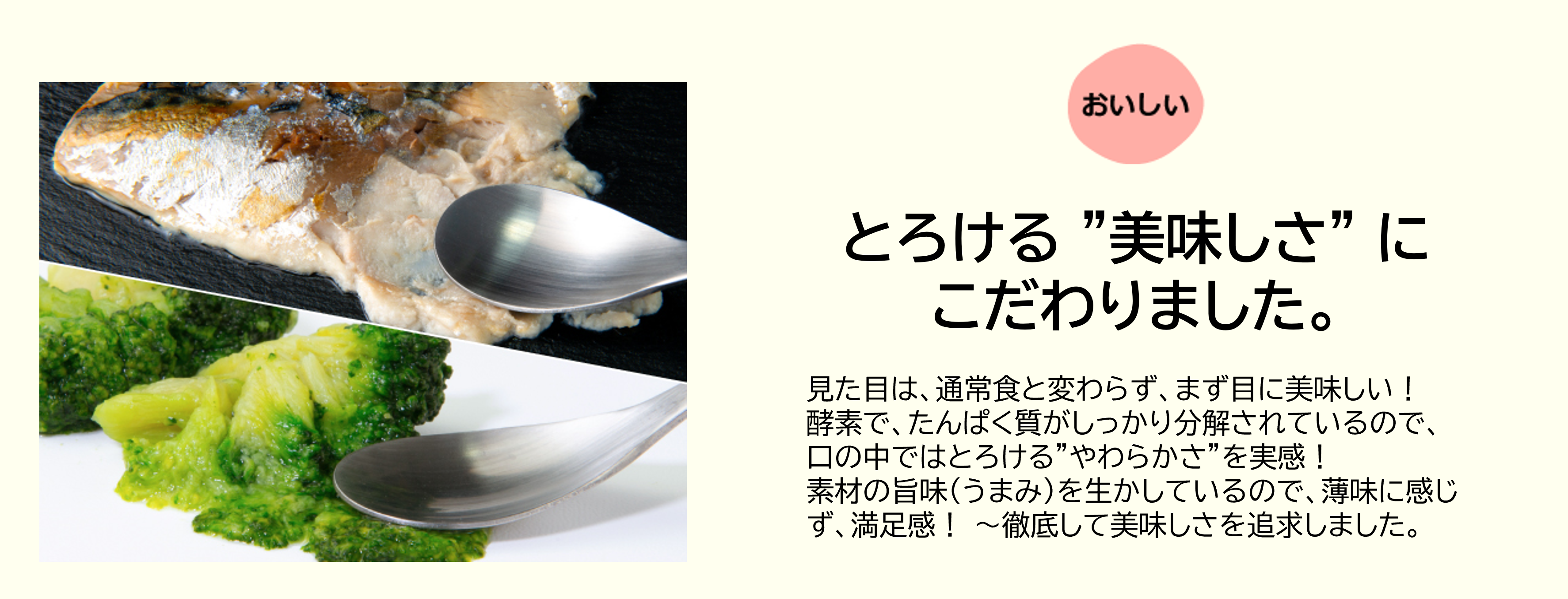 食卓の名医® 消化にあんしん® シリーズのやわらかい食材は、「凍結含浸法」という広島県(広島県立総合技術研究所食品工業技術センター)の特許技術(特許番号:第3686912号他)を活用しています。当技術は、酵素を用いて食材に含まれるたんぱく質や食物繊維を分解することで、食材のかたちを保ったままスプーンでつぶせるほど食材をやわらかく加工することができるものです。凍結含浸法を施した食品は、「あらかじめたんぱく質や食物繊維が分解(消化)されている」食品であり、見た目にもおいしく、安心して食べられます。