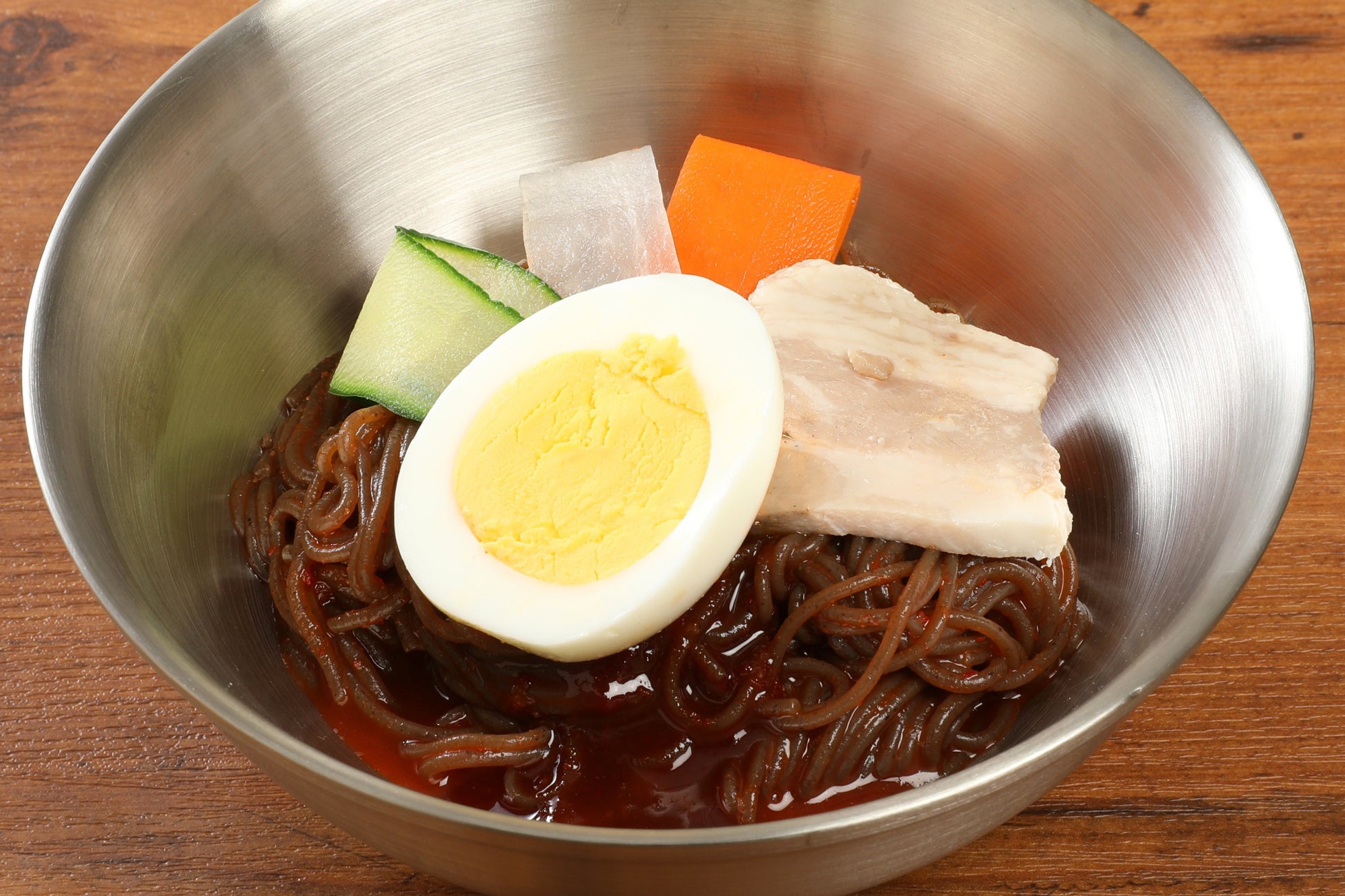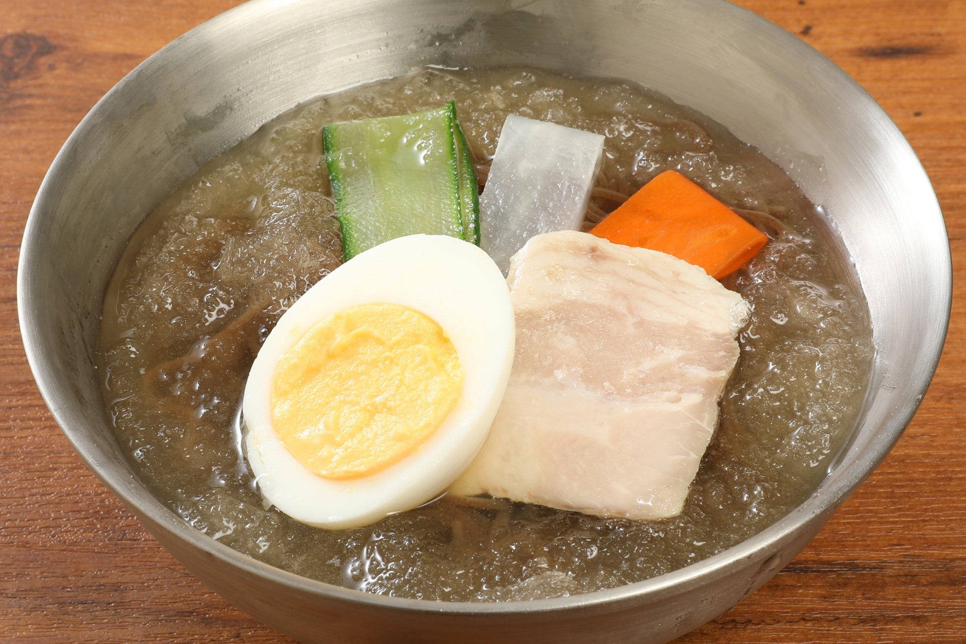 もう一つのオリジナルメニューが「フローズン冷麺」。冷麺のスープをシャリシャリ食感のフローズンに仕上げました。韓国冷麺独特のトトリ麺(韓国語で「どんぐり」を意味する「トトリ」の粉を生地に練り込んだ冷麺のこと)に甘めのスープにマッチするきゅうり・大根・にんじん・自家製なますをトッピング。ひんやり食感とつるつるした喉ごしが美味しい「フローズン冷麺」に仕上がっております。