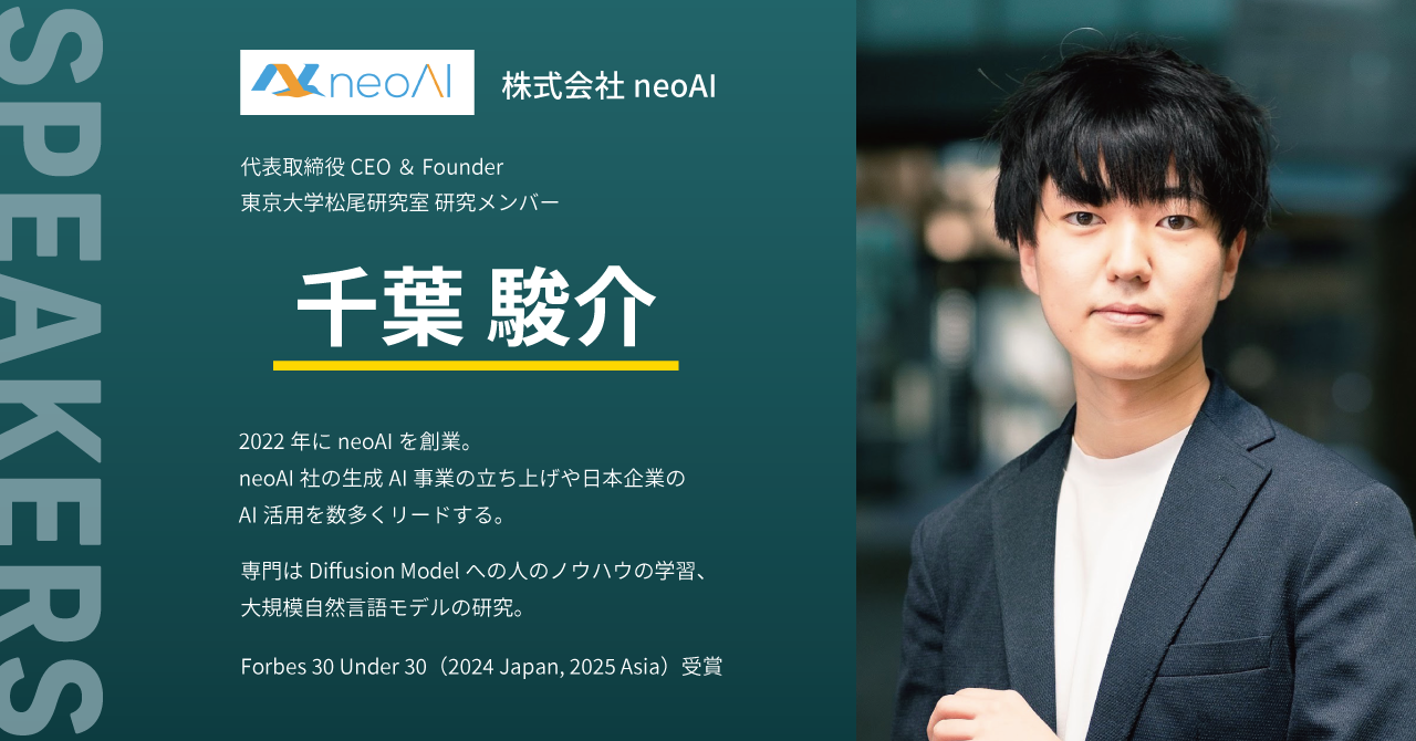 登壇するのは、東京大学 松尾研究室発のスタートアップであり、既に100社以上に生成AI導入を支援してきた「neoAI」の代表取締役 CEO 千葉駿介氏。