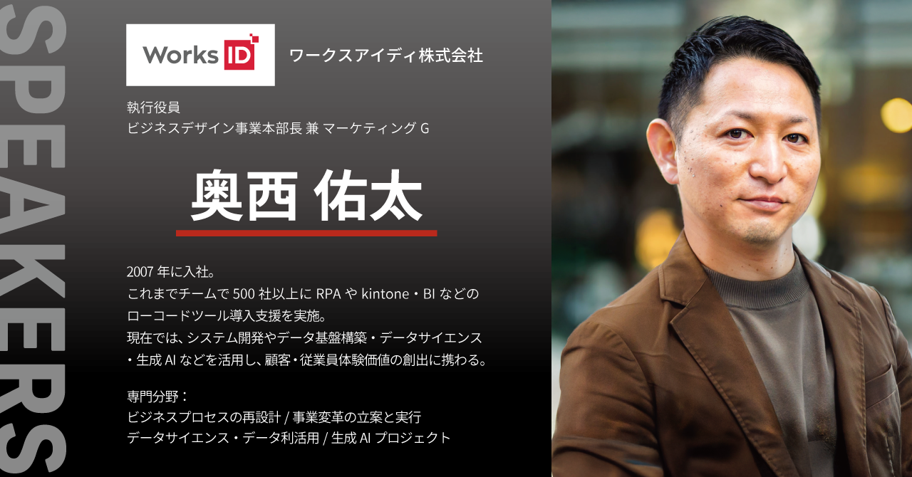 また、ワークスアイディからは、企業のバックオフィス業務を中心にAI活用を推進してきた奥西佑太が登壇。