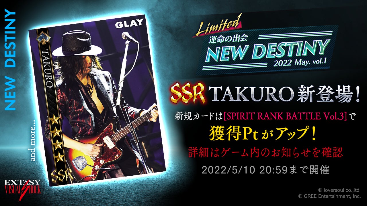「運命の出会 - LIMITED NEW DESTINY - 2022 May. vol.1」を1回行うごとに「運命の出会pt」が1pt増え、対象の「運命の出会pt交換所」で SSR[ARENA TOUR 2013 "JUSTICE & GUILTY"]TAKURO をはじめとした、新規カードと交換できます。