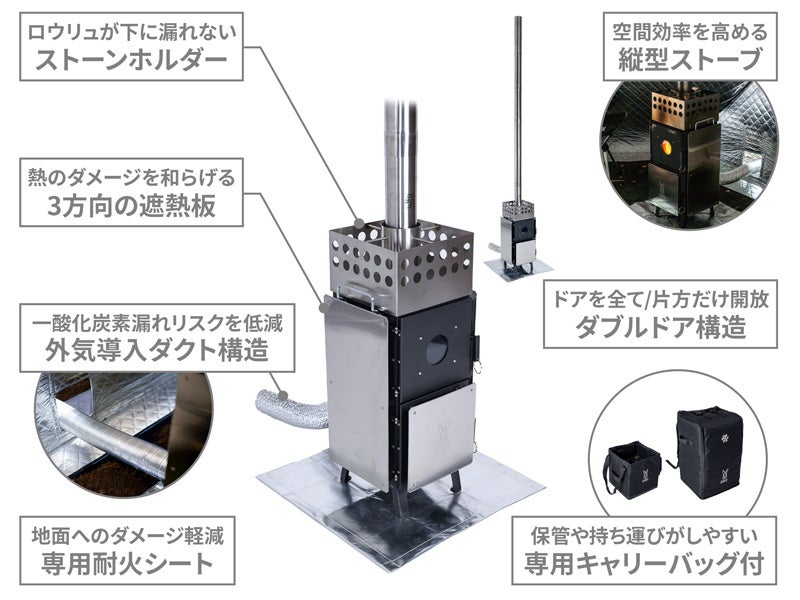 薪ストーブは縦長形状にすることで(横長形状が一般的)、十分な蓄熱性を保ちながら幕内で省スペースで利用できるよう設計しました。