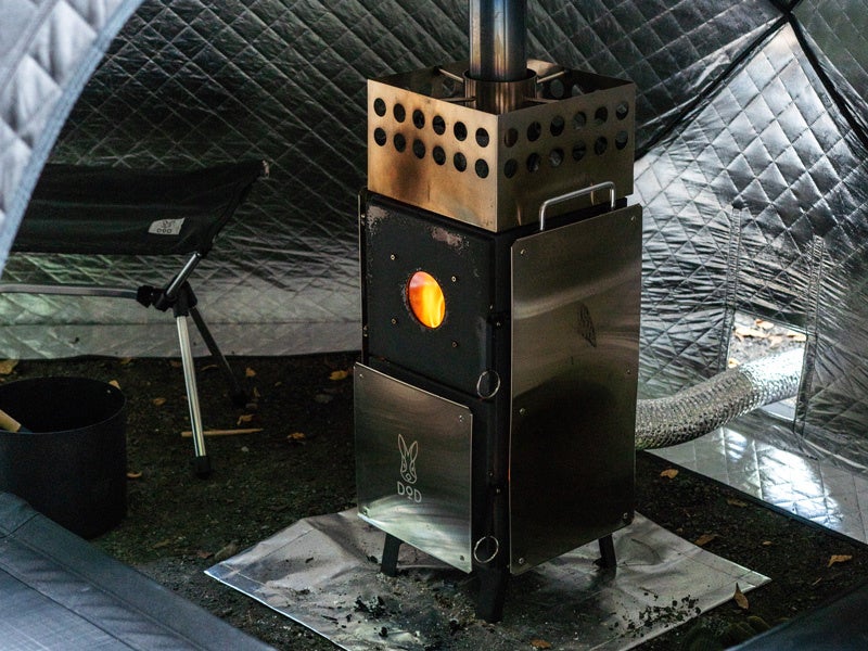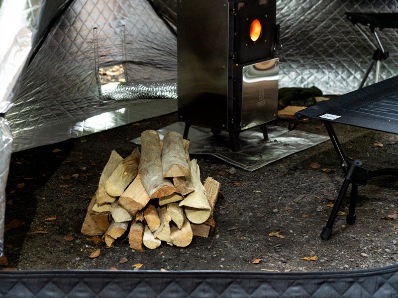 DODでは一般的なキューブ形状テントに比べて体積を約80%になるように設計し、少量の薪で温められるようにしました。