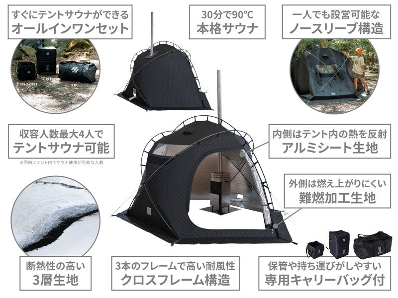 一般的なテントサウナ製品で懸念とされる重さ、大きさ、安全性リスクを軽減すべく、キャンプメーカーとしての開発ノウハウを活かし、本格ながらコンパクトで気軽に扱いやすいセットに仕上げました。