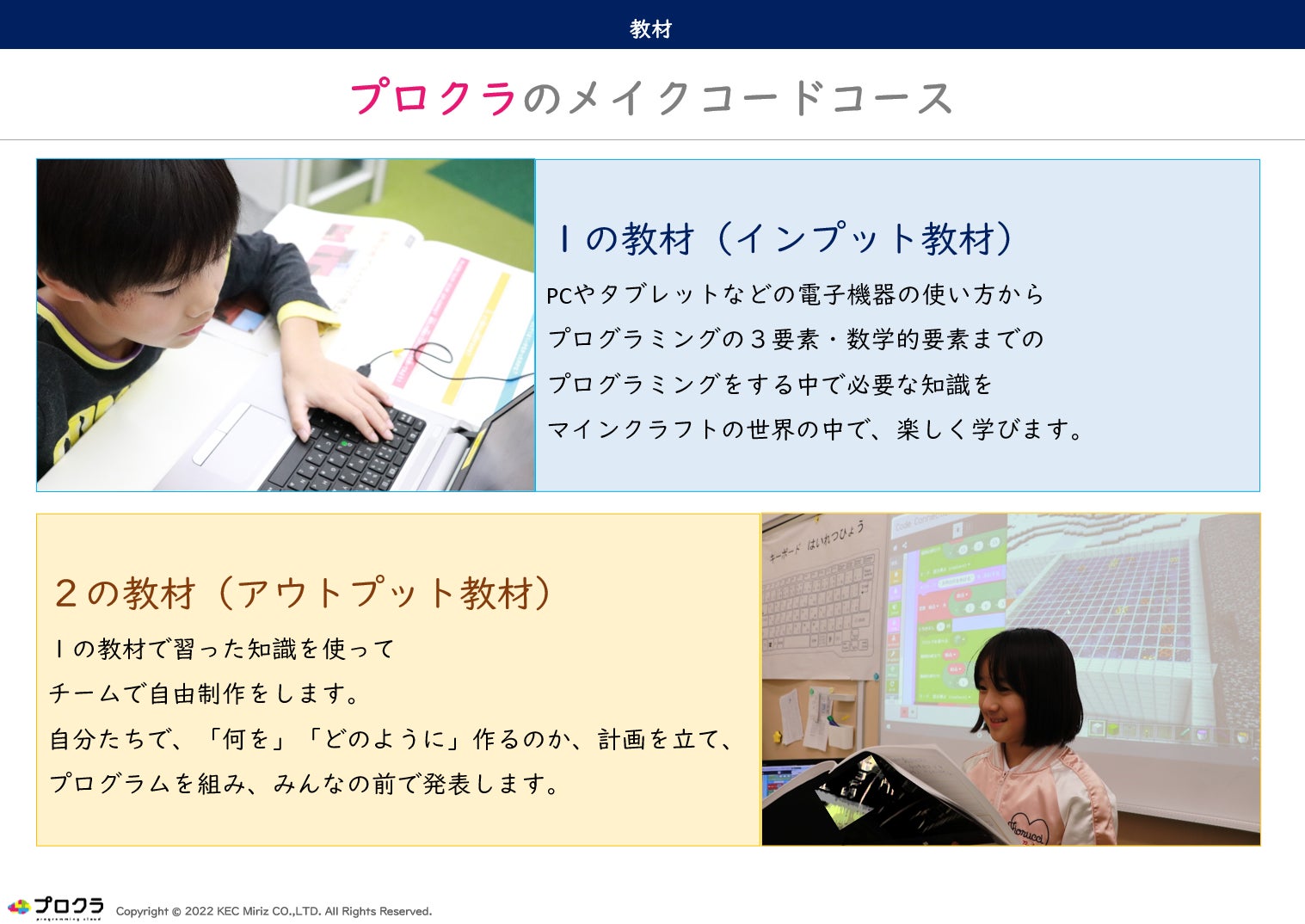 「学校プロクラ」は、生徒さんの主体的な学習を促進し、プログラミングを楽しく学習することができる新しいコンテンツです。私たち株式会社KEC Mirizは、今後もより良い学習環境の提供に努めてまいります。