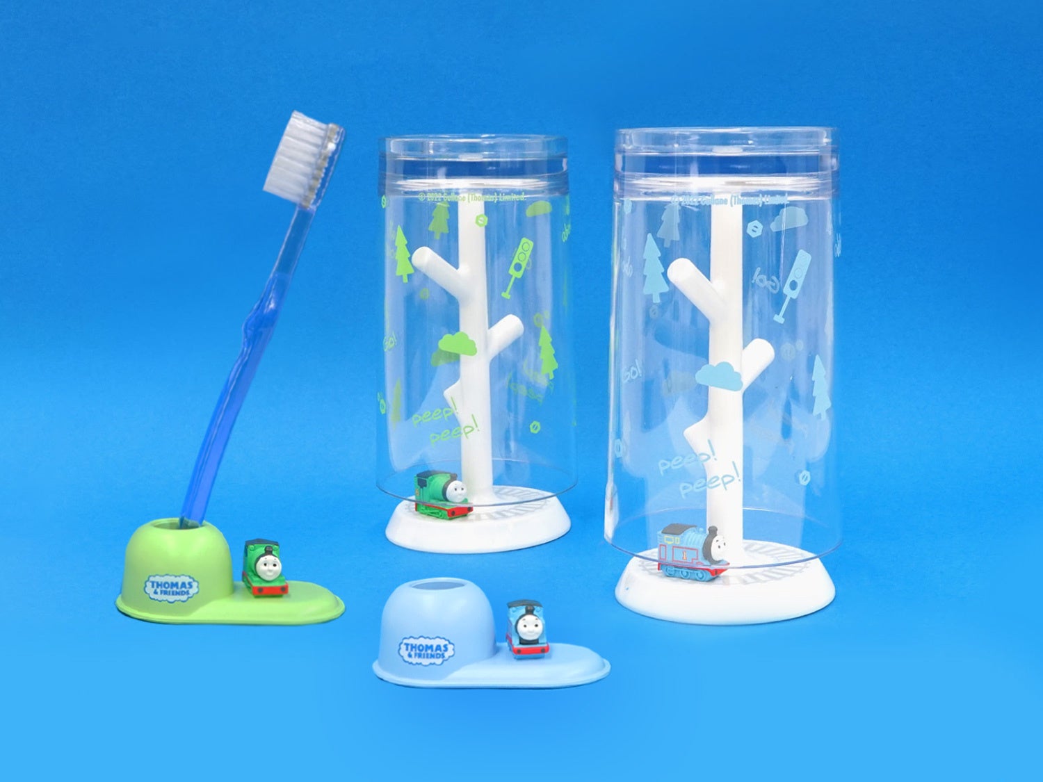 きかんしゃトーマスの可愛いキャラクターフィギュア(トーマス/パーシー)が付いた、うがいコップ&スタンドと、歯ブラシスタンドが新登場!