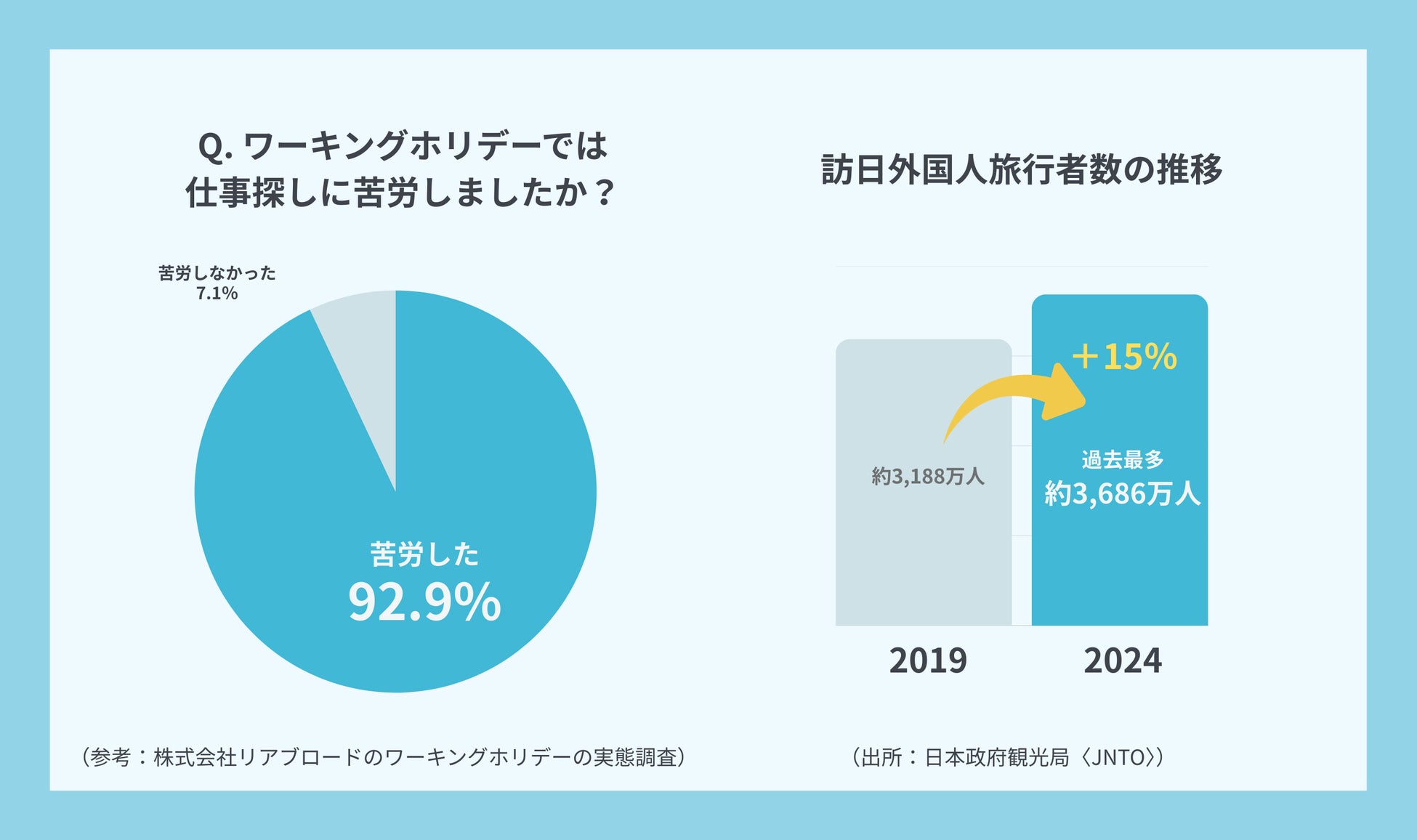 そこで注目されているのが、日本国内で英語を使った仕事経験を積む「国内ワーホリ」という選択肢です。訪日外国人旅行者数は2024年に過去最多の約3,686万人に到達。観光地やリゾート地では英語接客が必須となる職場が急増し、「国内でも英語を使って働ける」環境が全国で生まれています。