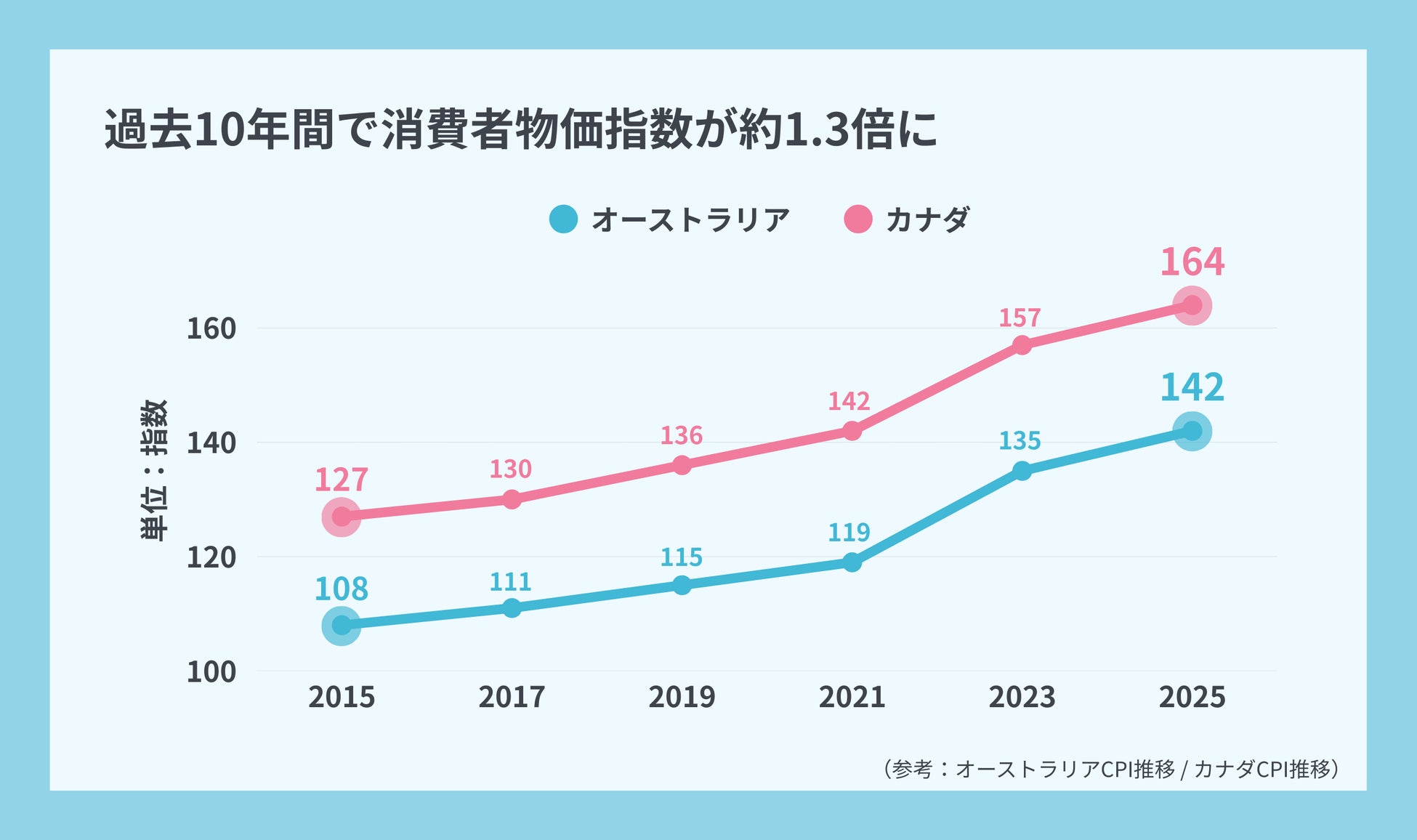 近年、海外ワーキングホリデーは費用面・就労面のハードルが急速に上昇しています。たとえば、人気渡航先であるオーストラリア・カナダの消費者物価指数(CPI)は過去10年で約1.5倍に上昇。さらに円安傾向も重なり、滞在費や生活費などワーホリに必要な総予算は年々増加しています。
