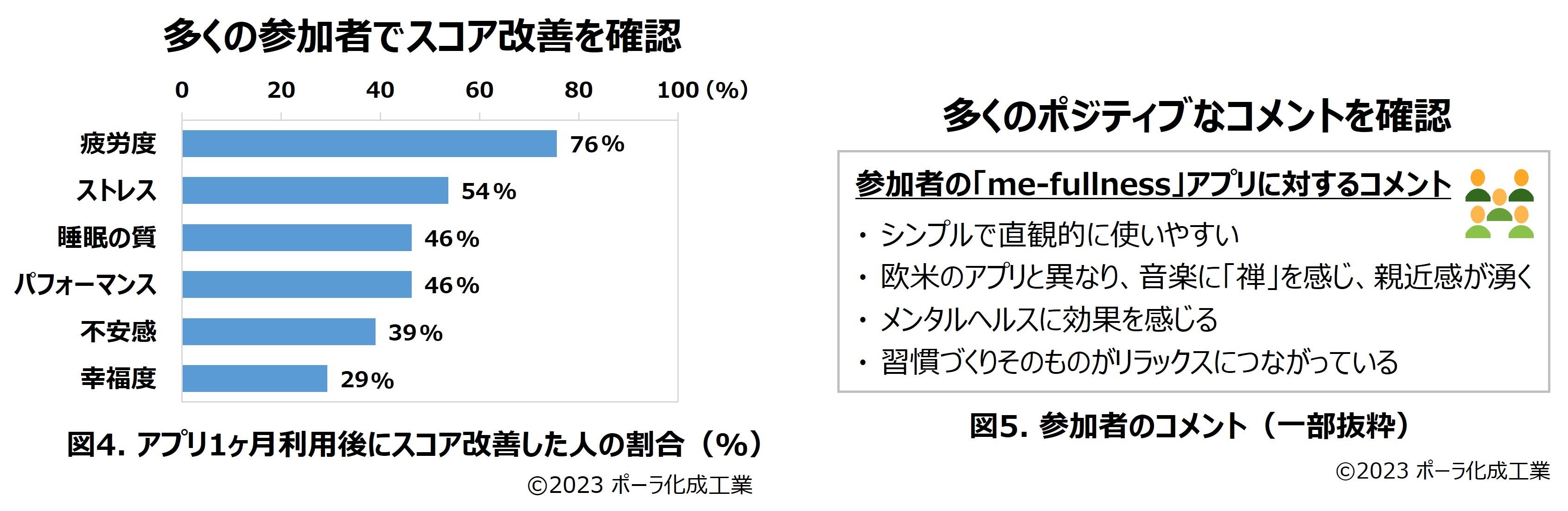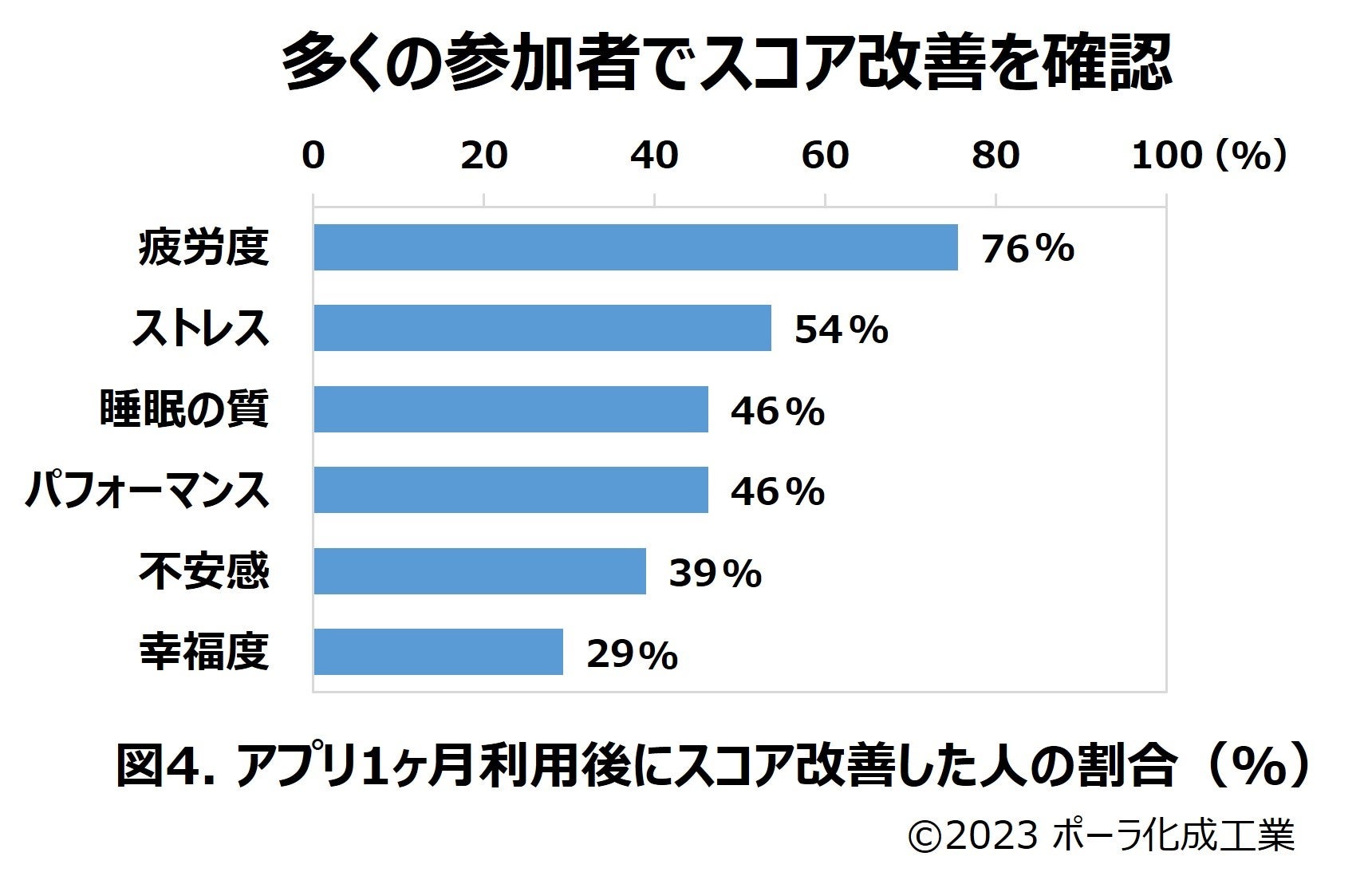 「疲労度」は約8割もの参加者で改善。また、「ストレス」「睡眠の質」「パフォーマンス」の改善率も約半数に上りました(図4)。「不安感」「幸福感」といった項目についても、3割以上改善した方がいることが確認できました。