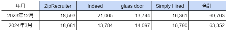 主要4サイト別の数値としては、「ZipRecruiter」が18,681件、「Indeed」が13,784件、「glass door」が14,097件、「Simply Hired」が16,790件となりました。