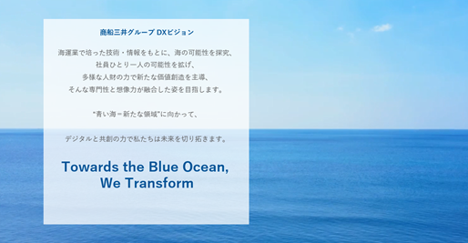 それらを融合させ、青い海、すなわち、我々の祖業である海運業に新たな変革をもたらし、その先にある新たな領域にむかって、デジタルと共創の力で未来を切り拓きたいという想いをビジョンに込めています。