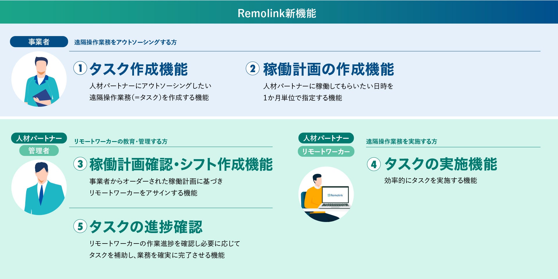 この新しいRemolinkの機能を活用したロボット遠隔操作業務のアウトソーシングサービスでは、社外人材によってロボット遠隔操作業務が柔軟かつ効率的に実行される仕組みを提供し、事業者の人材採用・教育・雇用維持負担の軽減と人件費最適化の実現を目指します。