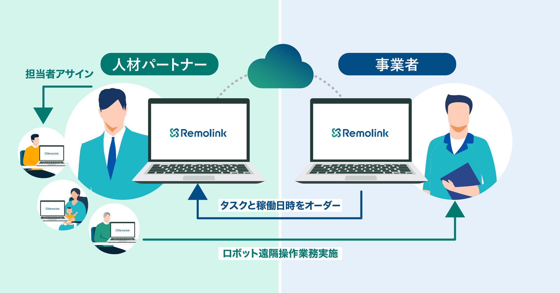 本アウトソーシングサービスは、事業者がRemolinkから社外人材に実施してほしいタスク(業務内容)と稼働日時をオーダーするだけのシンプルな仕組みです。