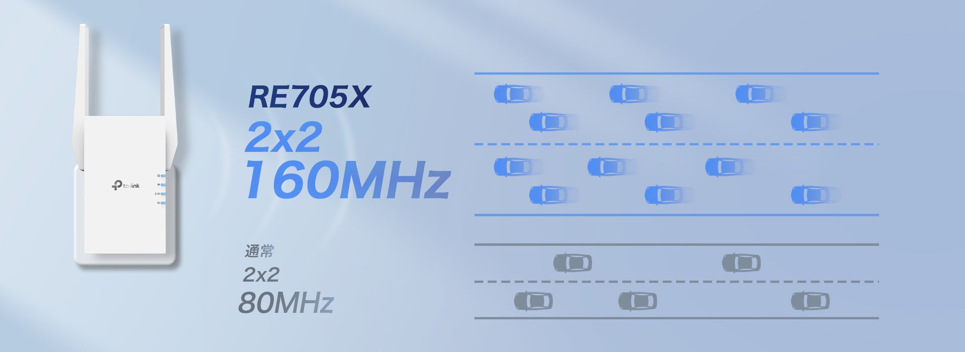 「RE705X」は、最大で合計2976Mbps(5GHz:2402Mbps + 2.4GHz:574Mbps)の高速通信を実現するデュアルバンドWi-Fi 6中継器です。2本の外部アンテナを搭載しており、5GHzバンドは2×2 160MHzに対応。安定した強力なWi-Fi接続をより効率的にお届けします。