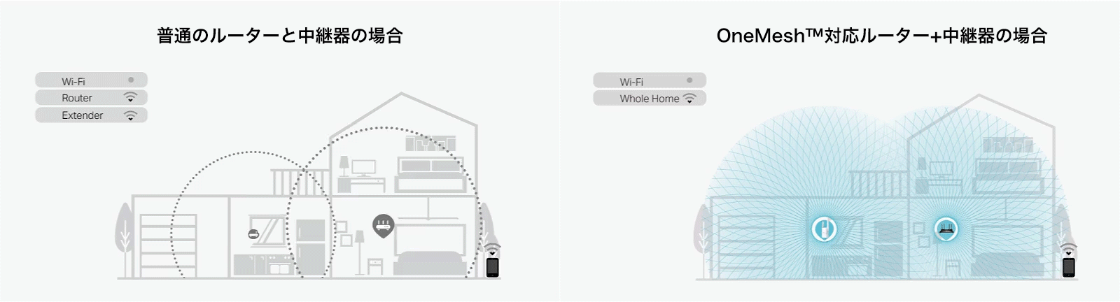 また、OneMesh™対応ルーターと連携すれば、お家の中を移動しながらでも途切れることのない、シームレスなメッシュ環境を構築できるため、家じゅうで快適なWi-Fi接続の利用が可能です。