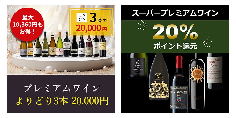 大好評のプレミアムワインのよりどり3本2万円セールを開催中!最大約10,000円もお得です。また、ワイン専門誌の評価も高いそうそうたるスーパープレミアムワインを、通常の2倍の20%ポイント還元でお届けします。ぜひじっくりとお選びください。