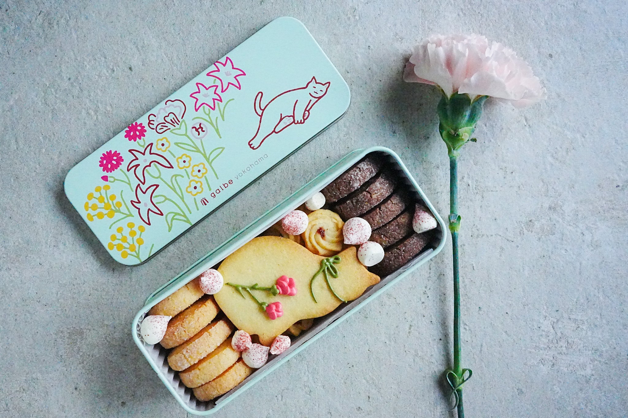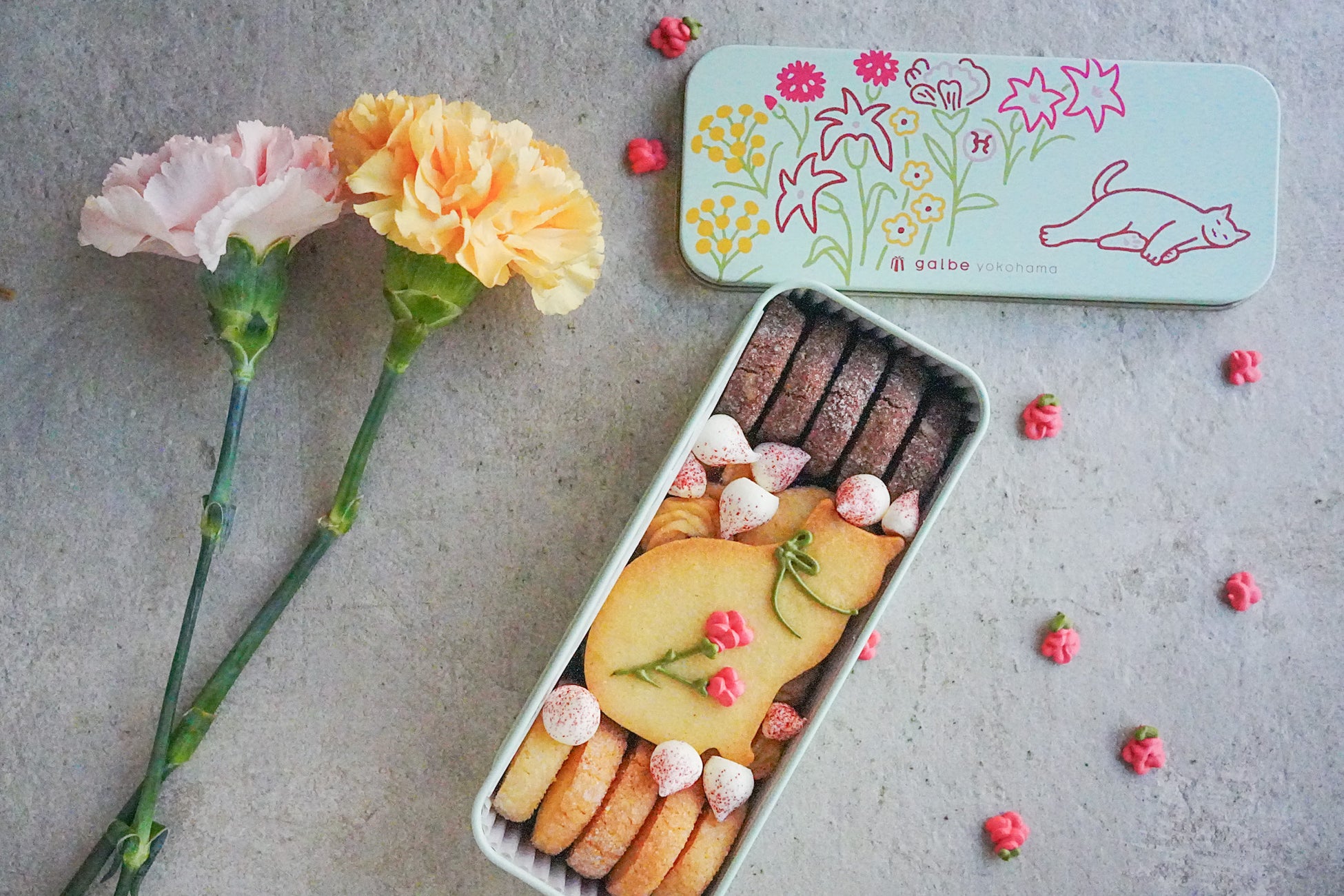 主役となる猫のアイシングクッキーには、カーネーションをイメージした装飾を施し、母の日らしい特別な一缶に仕上げています。