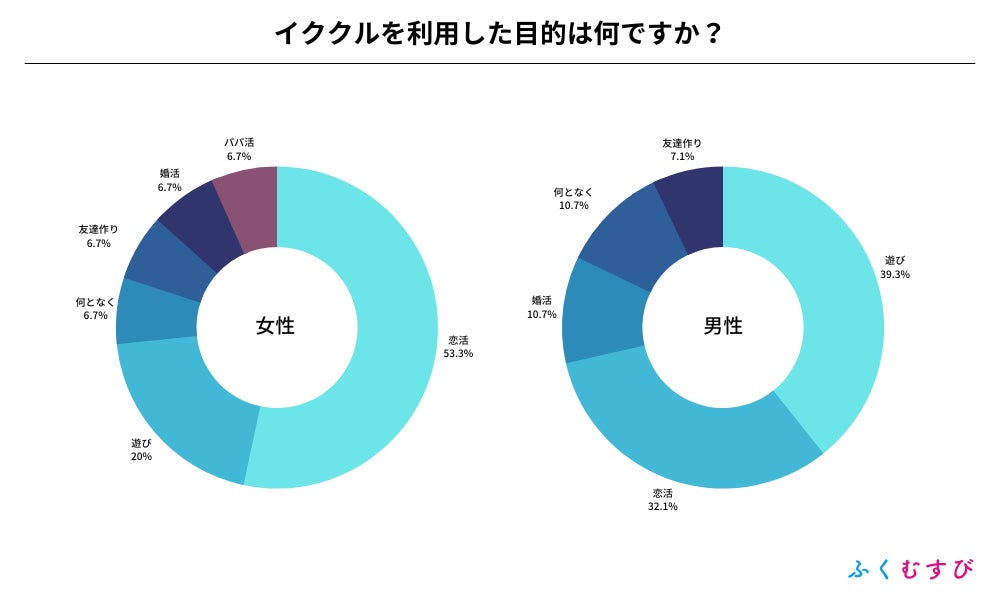 ・女性がイククルを利用した目的は、恋活が1位、遊びが2位となりました。