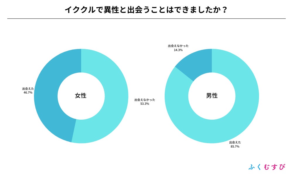 ・イククルで異性と出会えた割合は、男性が85.7%、女性が46.7%となりました。