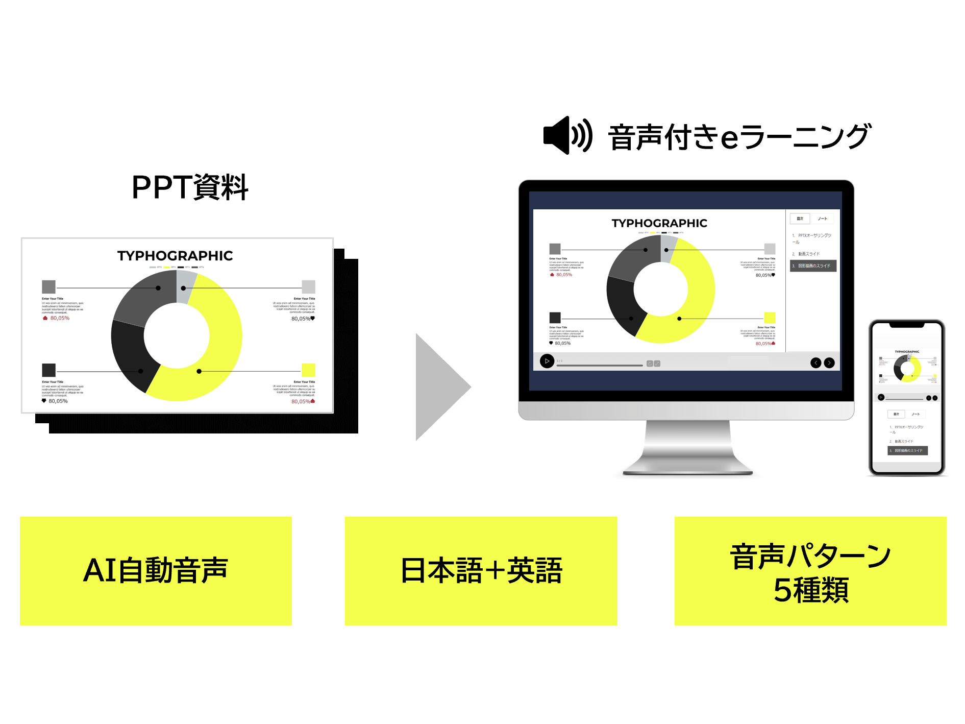 本機能をご利用いただくことで、音声の録音なく、音声付きのオリジナルeラーニングコンテンツの制作が可能です。
