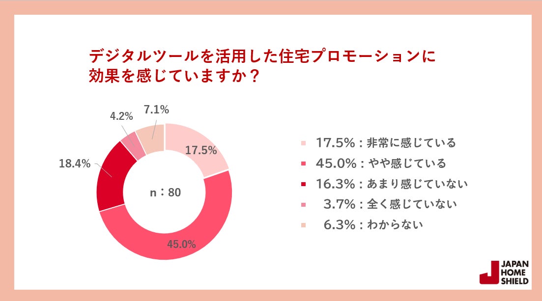 そのうち6割がデジタルツールを活用した住宅プロモーションに効果を感じている、と回答し、映像や動画でリアルに近い感覚で住宅の魅力を伝えることができるデジタルツールは当たり前の存在になりつつあります。