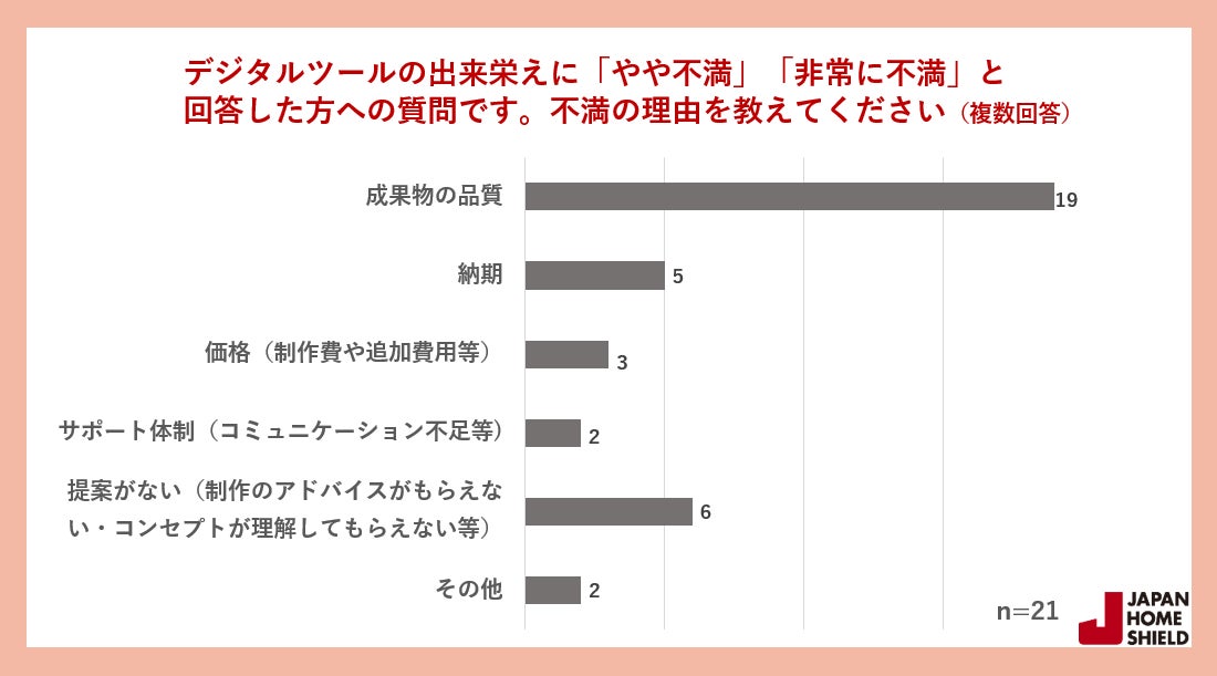 しかし、導入したデジタルツールの出来栄えには「非常に不満」「やや不満」と回答する方が一定数おり、その理由は「成果物の品質」が最も多く挙げられ、次いで「提案がない」に多くの回答がありました。