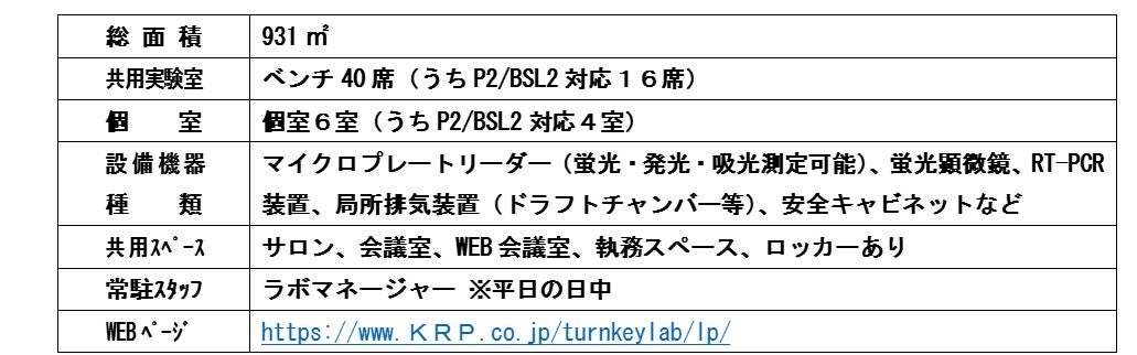 本施設4階にKRPによる日本初となる時間単位でラボスペースがレンタルできる日本最大級のシェアラボを運営します。