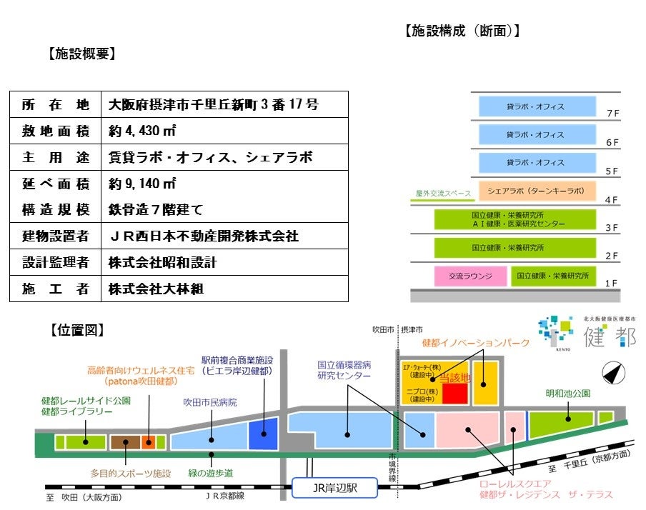 本施設は、国立研究開発法人医薬基盤・健康・栄養研究所(以下「医薬健栄研」)の研究施設として、東京から移転する「国立健康・栄養研究所」及び「AI健康・医薬研究センター」の入居に加え、企業等の進出や交流を促進する機能を担う施設として、ウェットラボ※2にも対応した「賃貸ラボ・オフィス」や京都リサーチパーク㈱※3(以下、「KRP」)が運営する日本初の時間単位でラボがレンタルできるシェアラボ「ターンキーラボ健都」を整備します。これらは、健都に進出を計画する企業だけではなく、ベンチャー企業やスタートアップを目指す研究者・学生等といった多様なニーズにも対応した研究開発環境を提供するJR西日本グループ初の事業です。