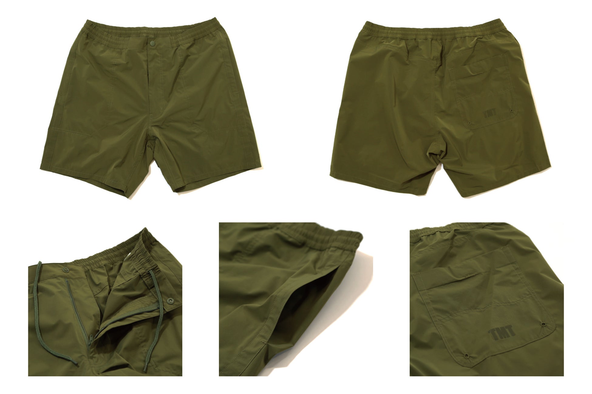 水陸両用のショートパンツ。 少しゆとりのあるシルエットですので、運動時にもおすすめです。 後のポケットに同系色のシリコンプリントでTMTロゴを施しています。 ブルゾン(TJK-S23SP01)と同素材のセットアップ展開です。