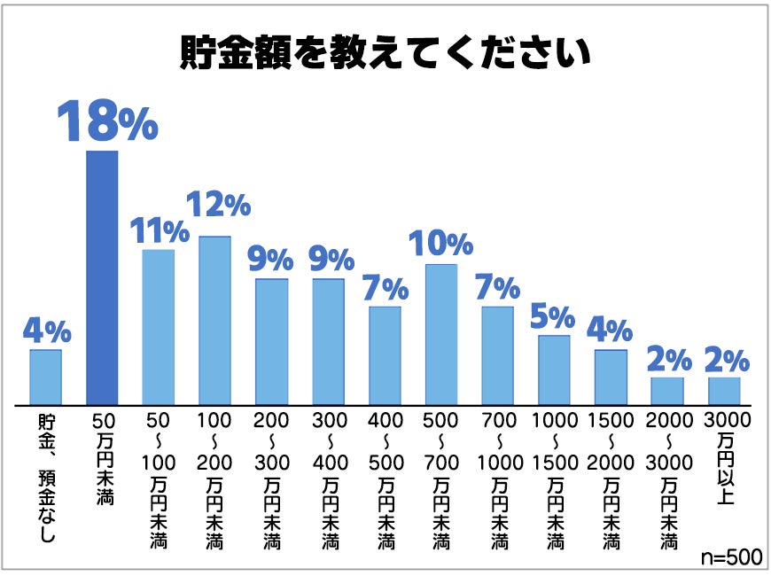 最も多いのは、「50万円未満」となりました。「預貯金なし」から「200万円〜300万円未満」までで半数ですが、これを多いとみるか、少ないとみるか。年代によっても解釈は違ってくるでしょう。