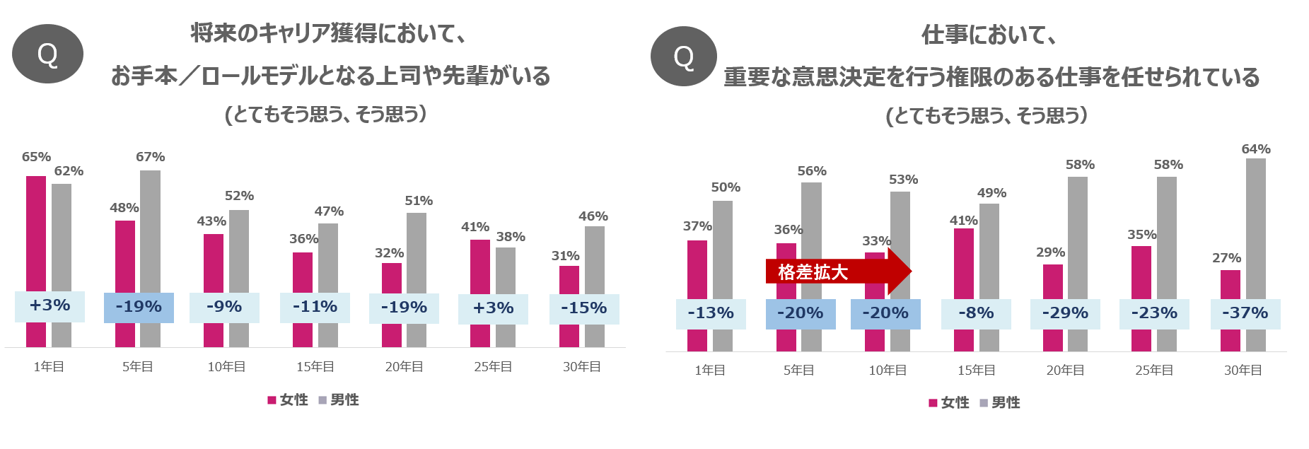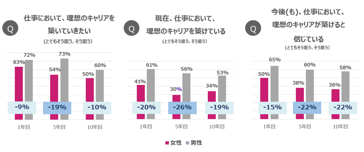 さらに、調査の結果、「女性だからという理由でキャリアを諦める人が10年目を境に急増する」という「10年目の壁」の存在が明らかになりました。その「10年目の壁」を生み出す背景として、社会人5年目からキャリア意識に男女間の格差が生まれている事実も判明し、管理職に就く機会の格差など目に見えるものからロールモデルの不在、正当な評価の機会の不足など、表に現れにくい課題も明らかになりました。