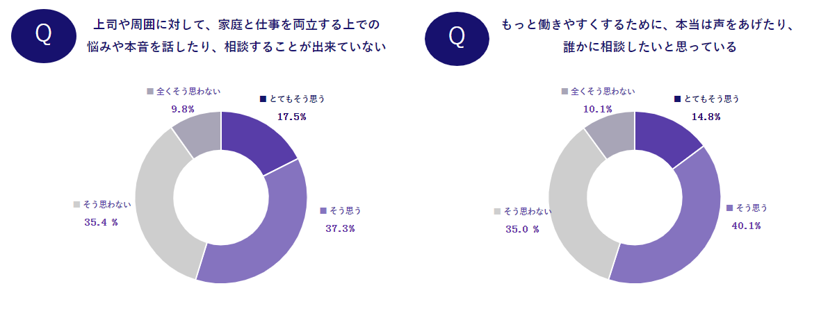 さらに、周囲に相談できていなかったり、声を上げたくても上げることができなかったりする実態があることが判明しました。このような「見えない痛み」を伝えきれていない現状も、女性がキャリアを諦めてしまう大きな要因であると考えられます。