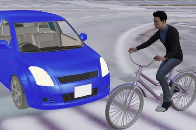 自転車事故多発交差点での事故発生状況を、愛媛県警交通部交通企画課の協力を得て、事故が起きやすい状況を5類型抽出。事故現場の写真とアニメーションで、発生しやすいシチュエーションを再現し、注意を促しています。