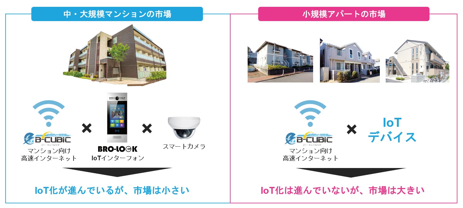 ブロードエンタープライズの主事業である集合住宅向け入居者無料インターネット「B-CUBIC」と併用して利用することで、コストを抑えながら物件のIoT化が可能になります。