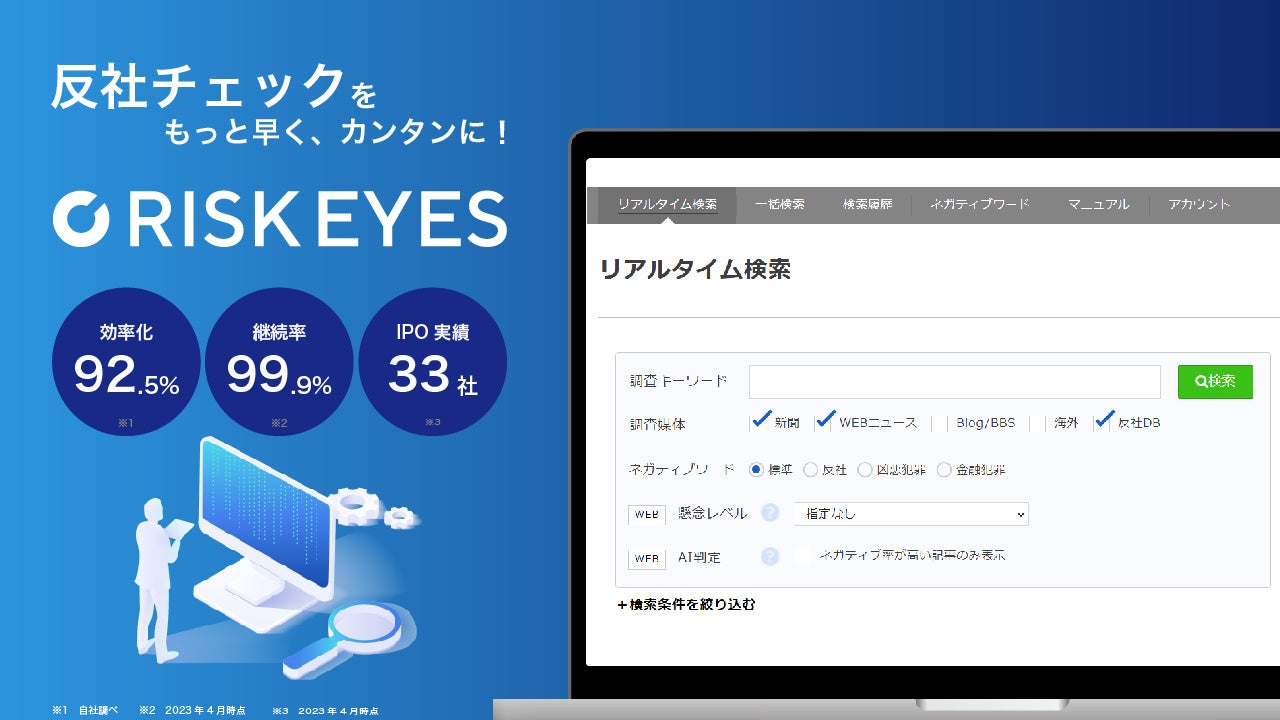 上場企業や上場準備企業、スタートアップを中心に、WEBニュース記事・新聞記事といった公知情報を用いて、取引先等が“反社会的勢力”、“犯罪”、“不祥事”などに関与した疑いがないかを効率よくチェックする反社チェックツール「RISK EYES(リスクアイズ)」を提供。