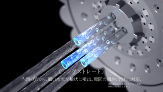 吐水する際に水流の内部を空洞にした直進性の高い吐水。ウルトラファインバブル発生機構に加え、リング状に吐水された吐水の空洞部でも気流を巻き込むことによって、より多くのウルトラファインバブルを生成します。リング状にする事によって、水流の外流が薄膜状態となったことから物と衝突した瞬間に隙間や凹凸内に入り込むことで、今まで及ばなかった部分にまで水流が届きます。衝突感は少ないながら、すき間への洗浄に適していることから、歯間洗浄などに威力を発揮します。