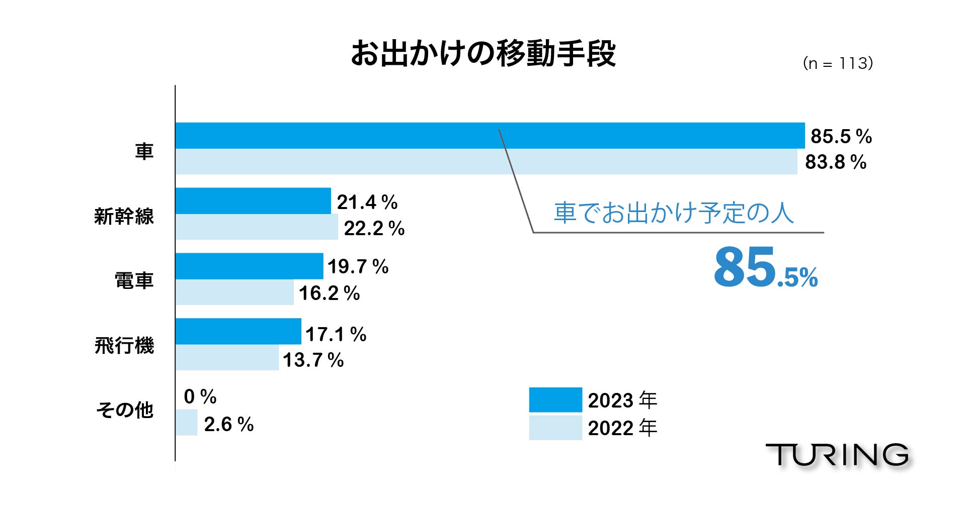 今年のGWに出かける予定の人に、お出かけの移動手段について尋ねたところ、「車」が85.5%と最も多く、次いで「新幹線」が21.4%という結果になりました。こちらの調査項目に関しても去年と比べて大きく変化はなく、新幹線や電車などと比べ、圧倒的に車で移動する人が多いことがわかりました(n=113)。